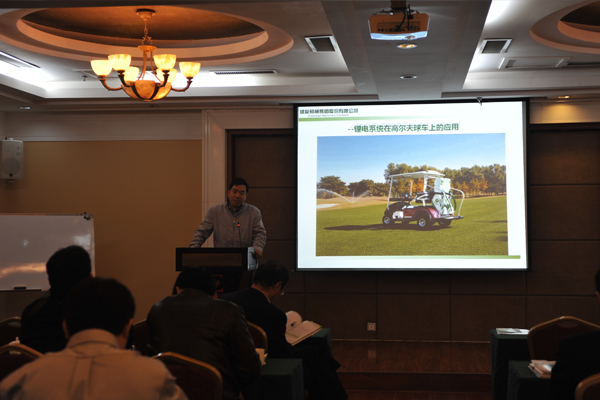 會議第二項(xiàng)內(nèi)容由綠友集團(tuán)OHEV事業(yè)部張得玉先生匯報(bào)鋰電系統(tǒng)在高爾夫球場上的應(yīng)用。這是個(gè)全新的課題,大家聽得非常認(rèn)真。在高爾夫業(yè)內(nèi)現(xiàn)階段使用的都是鉛酸電池,張得玉先生從鉛酸電池對環(huán)境的污染和鉛酸廢舊電池如何處理,以及鉛酸電池性能與鋰電電池性能的巨大差距等幾個(gè)方面匯報(bào)了行業(yè)內(nèi)目前的狀況。由于鉛酸電池本身性能上有缺陷,使用壽命短,業(yè)內(nèi)以后的發(fā)展趨勢一定會向著更加環(huán)保、安全和性能卓越方面發(fā)展,綠友集團(tuán)走在了行業(yè)的前面。