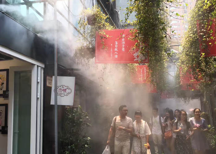作為上海的3A景區(qū)之一,田子坊每天都人頭攢動(dòng),連日高溫讓許多游客不能細(xì)細(xì)品味老上海的弄堂風(fēng)情。為此,管委會(huì)采用了綠友集團(tuán)自行研發(fā)制造的GREENMAN造霧系統(tǒng),200多個(gè)噴頭每小時(shí)噴霧三次,每次噴霧2分鐘,配合弄堂兩邊墻壁種植的綠化,不僅美化了街景,更對(duì)降低整個(gè)田子坊的溫度起到了有效的作用?,F(xiàn)場(chǎng)溫度計(jì)顯示,不進(jìn)行噴霧的弄堂溫度是36 攝氏度,噴霧后,弄堂溫度顯示33攝氏度,最低的地方溫度甚至降到28攝氏度,降溫明顯。