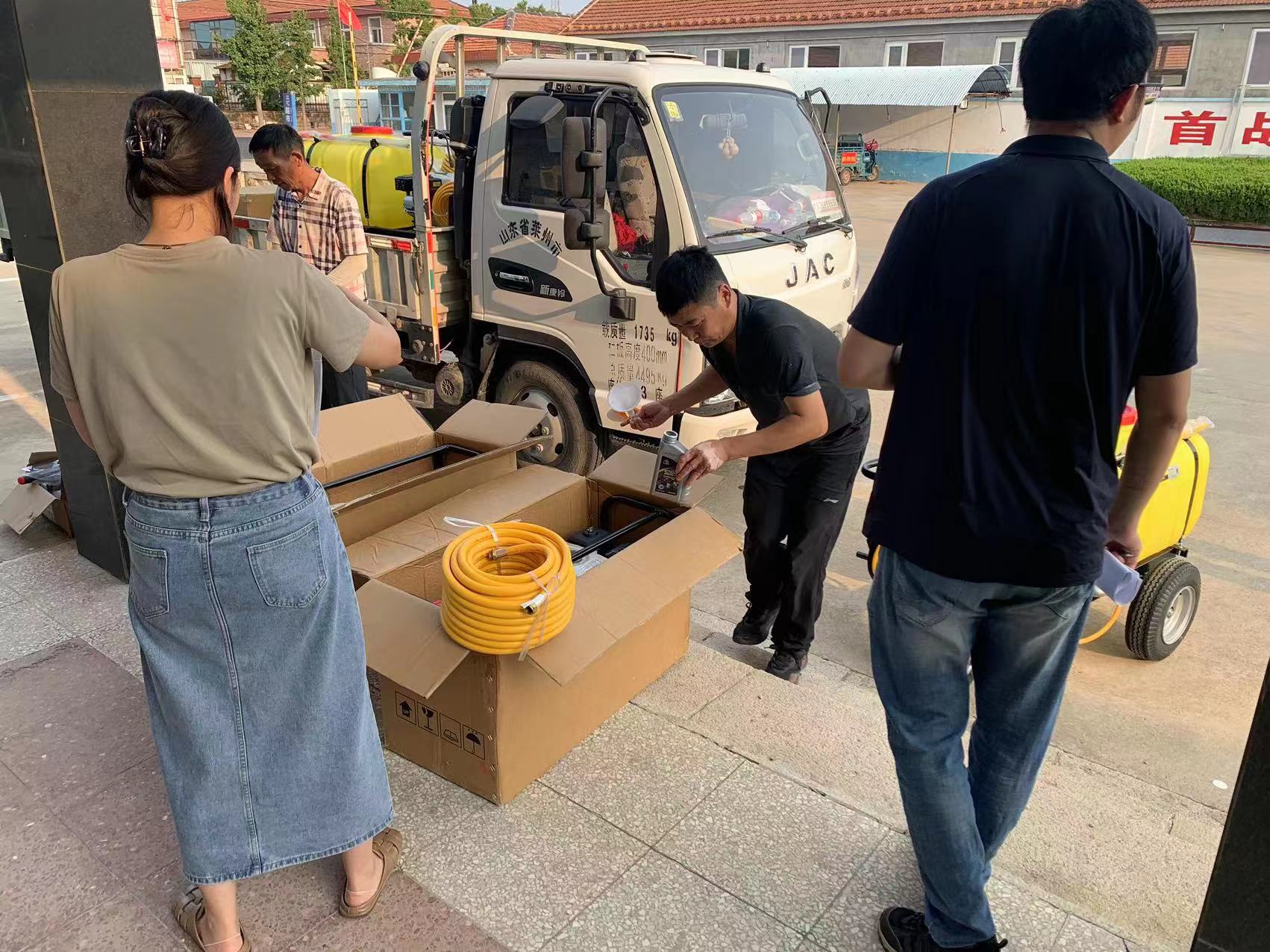 工具到貨,為盡快完成供貨,濰坊綠友的同事們一件件、一箱箱卸到庫(kù)房,根據(jù)每個(gè)鎮(zhèn)的需求,按型號(hào)按數(shù)量分裝、核對(duì),為打藥機(jī)加注機(jī)油以便客戶使用。汗水模糊視線、打濕衣襟,卻毫不影響同事們的工作勁頭。
