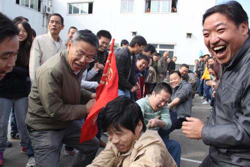 拔河比賽是最考驗(yàn)團(tuán)隊(duì)凝聚力的項(xiàng)目了。裁判員一聲令下,所有的選手勁往一處使,勒緊麻繩不放松,在強(qiáng)有力的“1、2、3”的口號下,每個(gè)參賽者使出九牛二虎之力,把繩子往自家起點(diǎn)線邊拉。只見繩索中心的紅線忽而左忽而右,參賽選手們絲毫不放松,腿彎了、差點(diǎn)就坐在地上了,大家又一股力量地往回拉。圍觀的同事們急得直跺腳,嘴上喊著“加油、加油”,手還一直往一邊“推”,好像自己也在拉著比賽繩一樣。在這場力量與意志的比拼中,拓寶二、營銷二部、草坪灌溉聯(lián)合組奪得了最后的勝利。