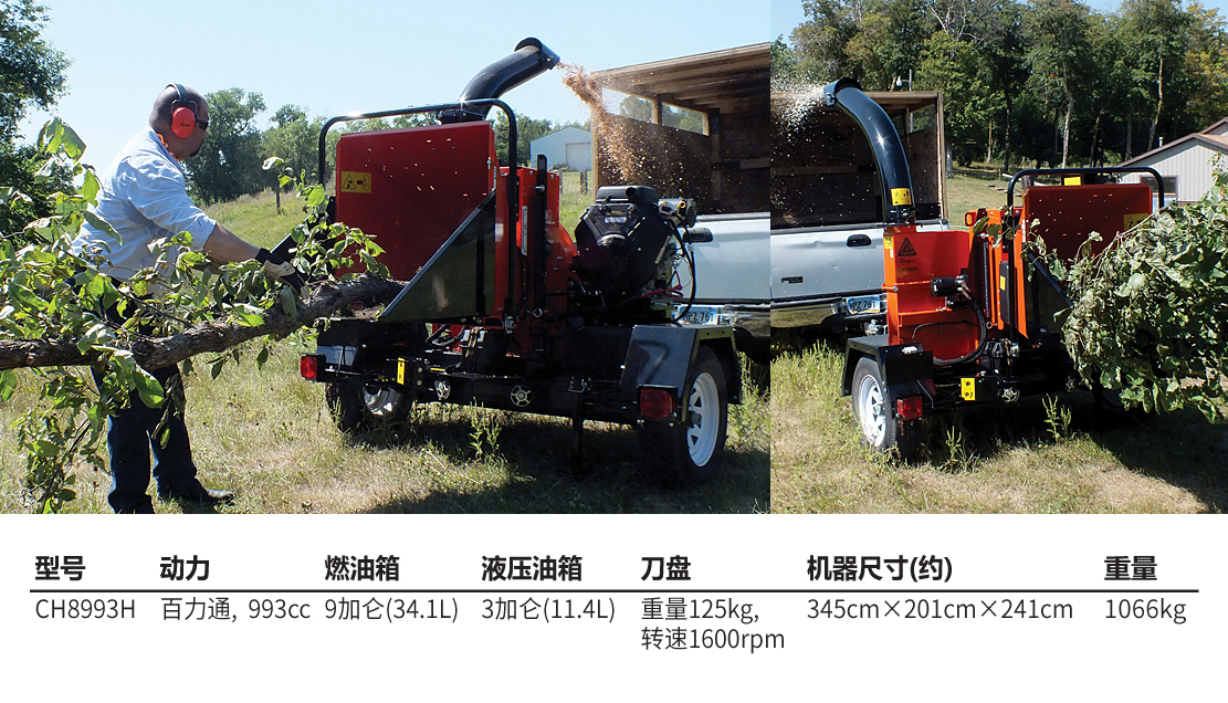 老熊(BEARCAT)品牌樹枝粉碎機(jī),配置百力通先鋒993cc發(fā)動(dòng)機(jī),最大可切削直徑20cm樹枝。
