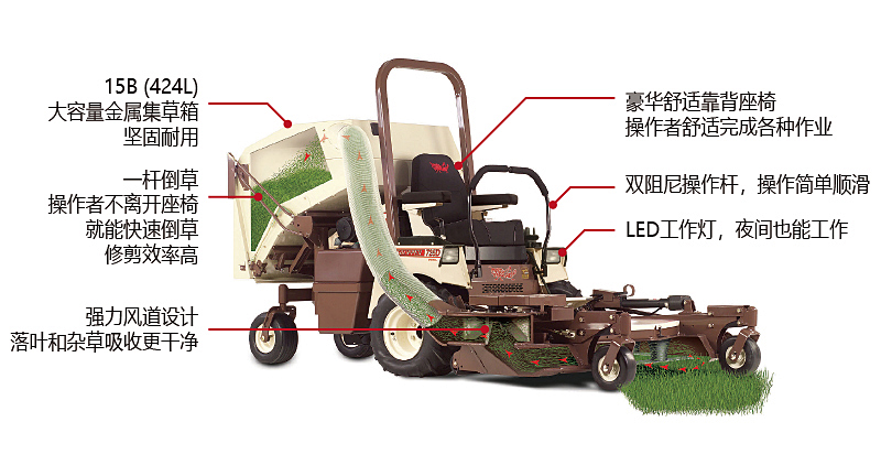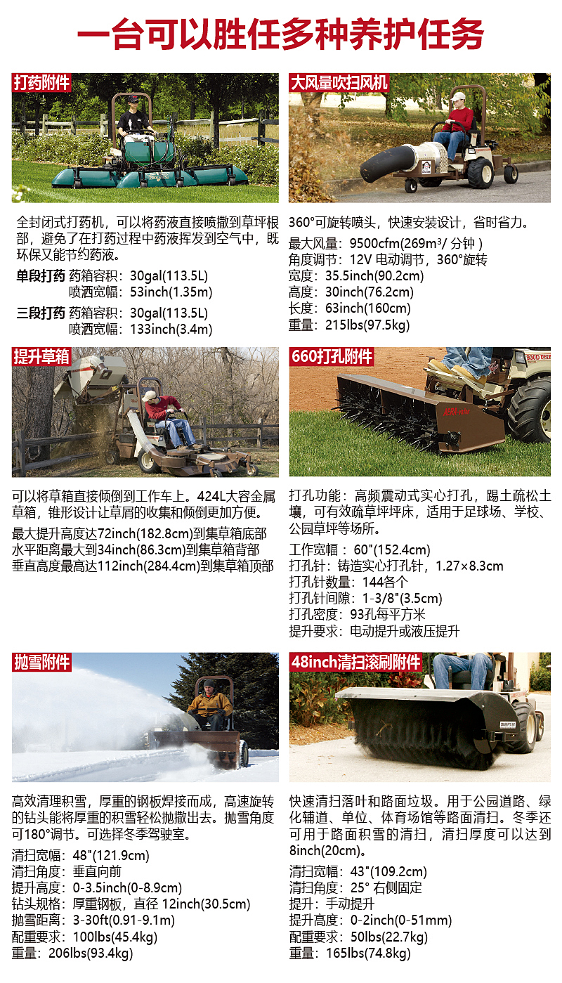 多種功能附件可供選擇:收草、梳草、切邊、密閉打藥、打孔、風(fēng)機(jī)、遮陽篷等。