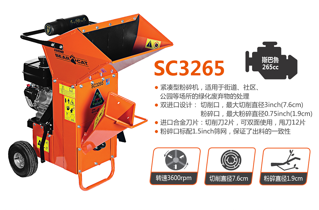 老熊(BEARCAT)品牌小型粉碎機,配置斯巴魯265cc發(fā)動機,擁有切削、粉碎兩個進料口,以及可更換出料篩網(wǎng),最大可以切削3英寸(7.5cm)枝椏。體積小,操作靈活,適用公園、廣場、物業(yè)等多種區(qū)域。